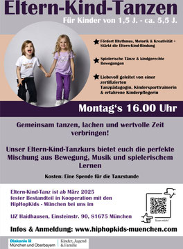 ab März 2025 findet eine Eltern-Kind- Tanztreff Montags 16.10- 16.40/ 16.45 im IJZ Haidhausen, Einsteinstr.90, 81675 München statt.
